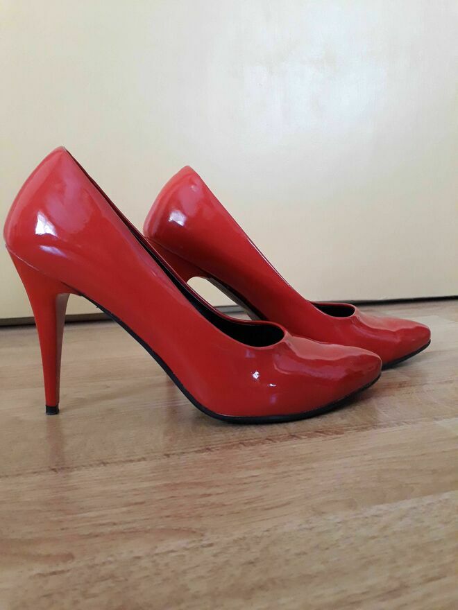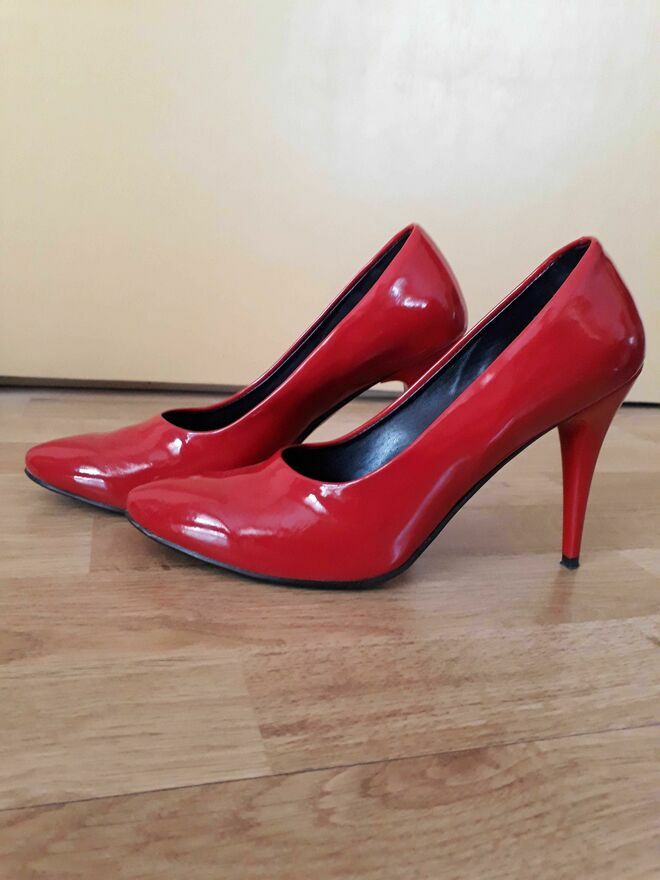 Eleganckie buty lakierki na wysokim obcasie w kolorze czerwonym (obcas plastik, nie obciągany skórą). Stan używany - nałożone 1 raz. Rozmiar "mała" 38.Benek