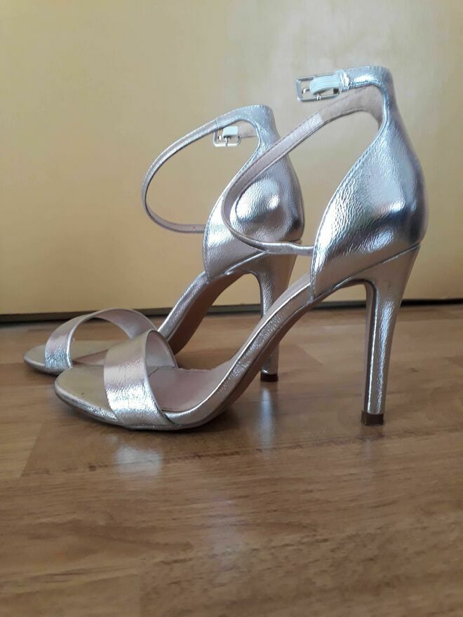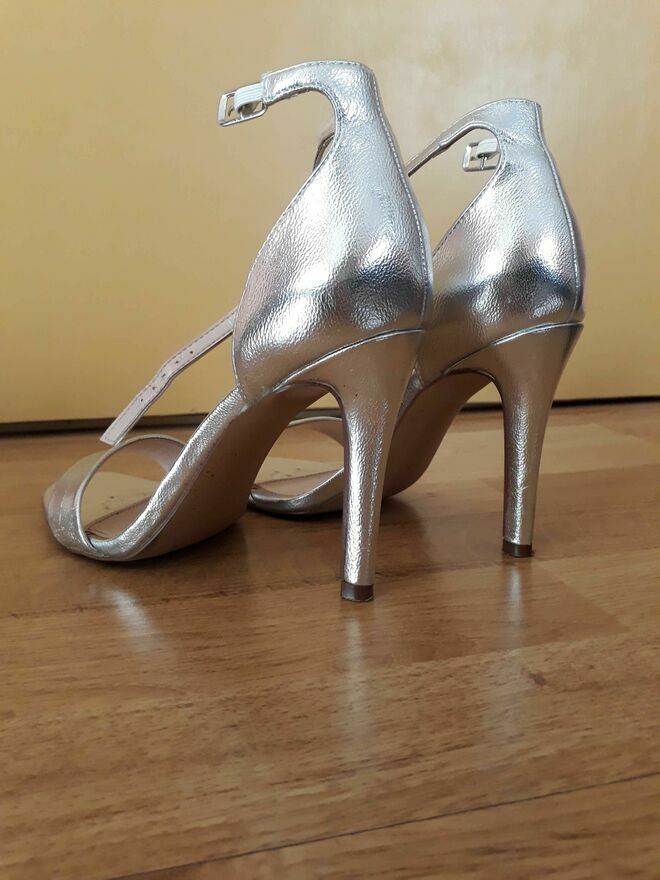 Damskie buty na wysokim obcasie w kolorze srebrnym. Używane - noszone kilka razy.Benek