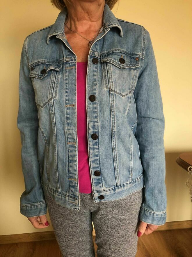 Damska kurtka jeansowa w kolorze niebieskim, wykonana z materiału denim. Mało używana - stan bardzo dobry. Rozmiar mała 40 (M/L) na wzrost 158/164. Długość bluzy 54 cm, w ramionach 41 cm, pod pachami 54 cm, dł. rękawa z mankietem 64 cm. Mój wzrost 158 cm. Mogę wysłać.Benek